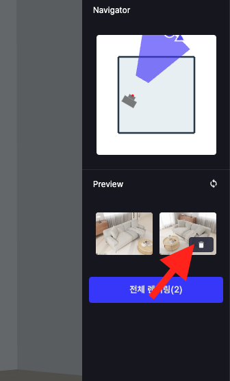 여러 장을 다운로드 하고 싶거나 렌더샷을 삭제할 때 클릭합니다.