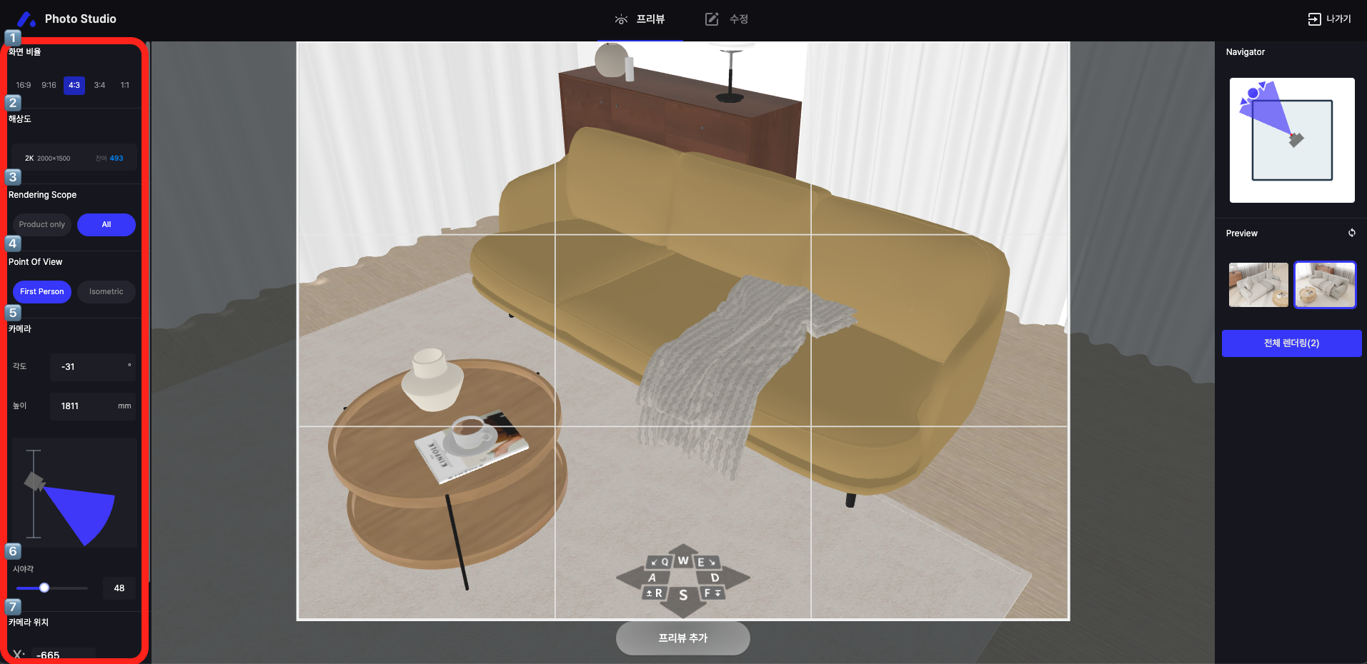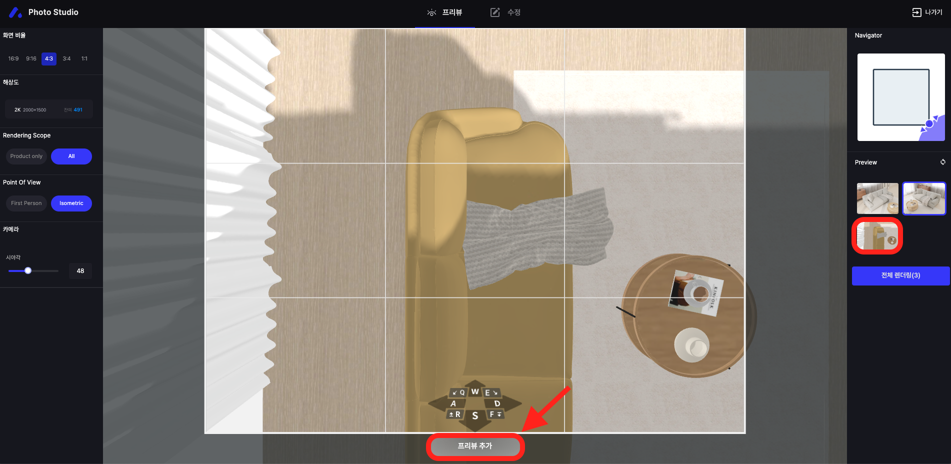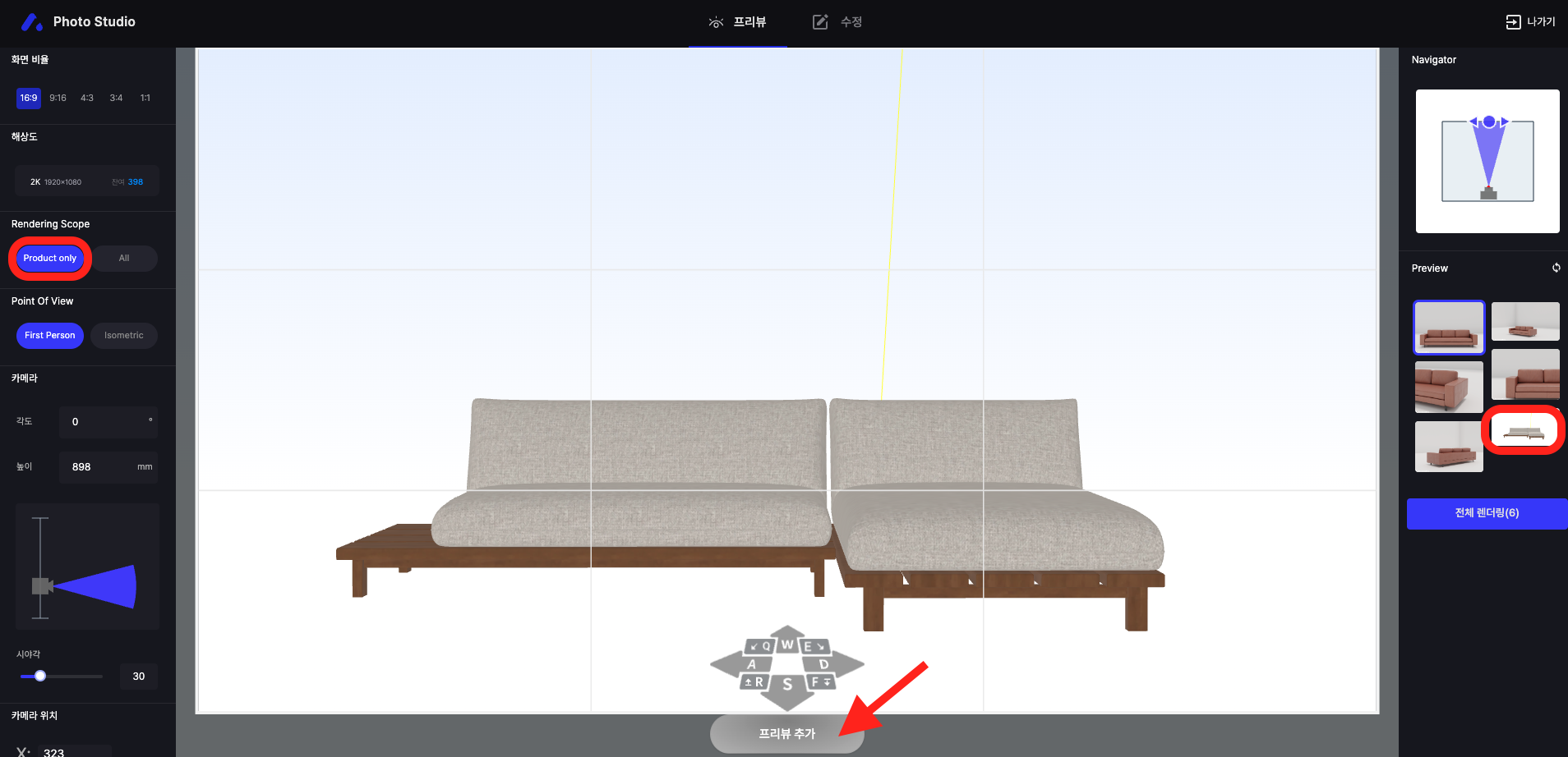 우측 Preview는 구도 참고용 이미지입니다. 실제 렌더링 시에는 촬영 대상 제품이 나옵니다.