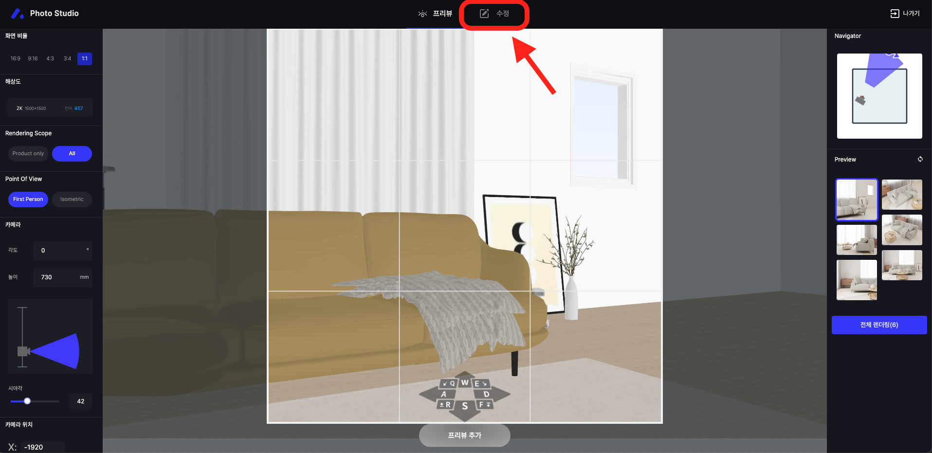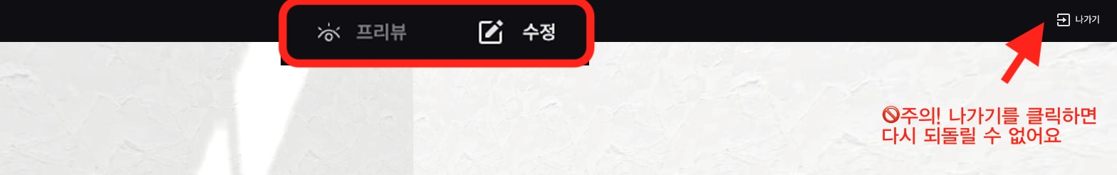 수정 후 렌더링을 하려면 [프리뷰] 탭으로 이동해야 합니다. [나가기] 버튼을 누르면 창이 종료됩니다.