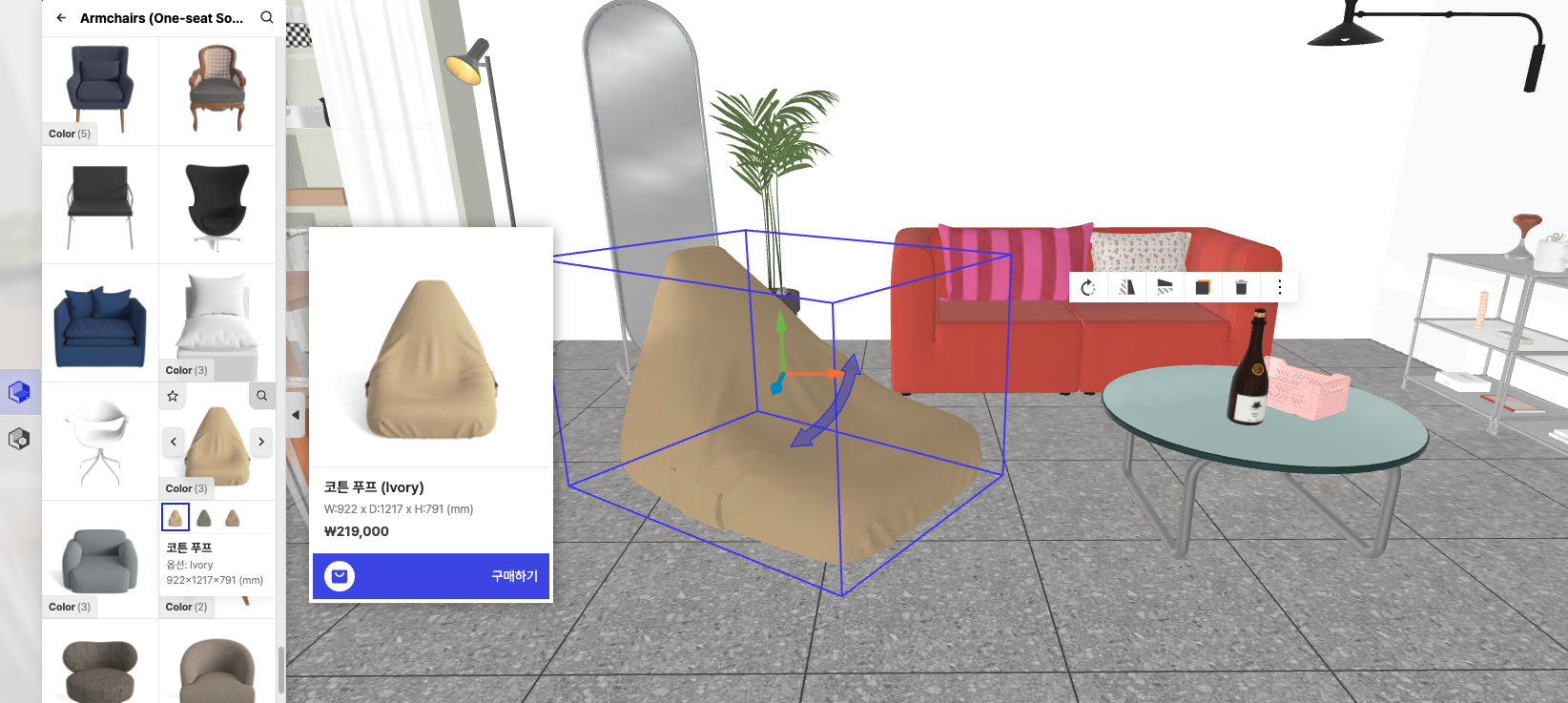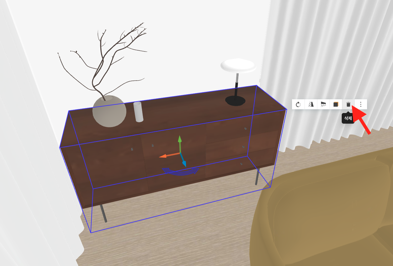 에디터에서의 사용 방법과 거의 유사하므로, 더 배우고 싶으시다면 (가구 배치 방법 가이드→)를 참고해 주세요.