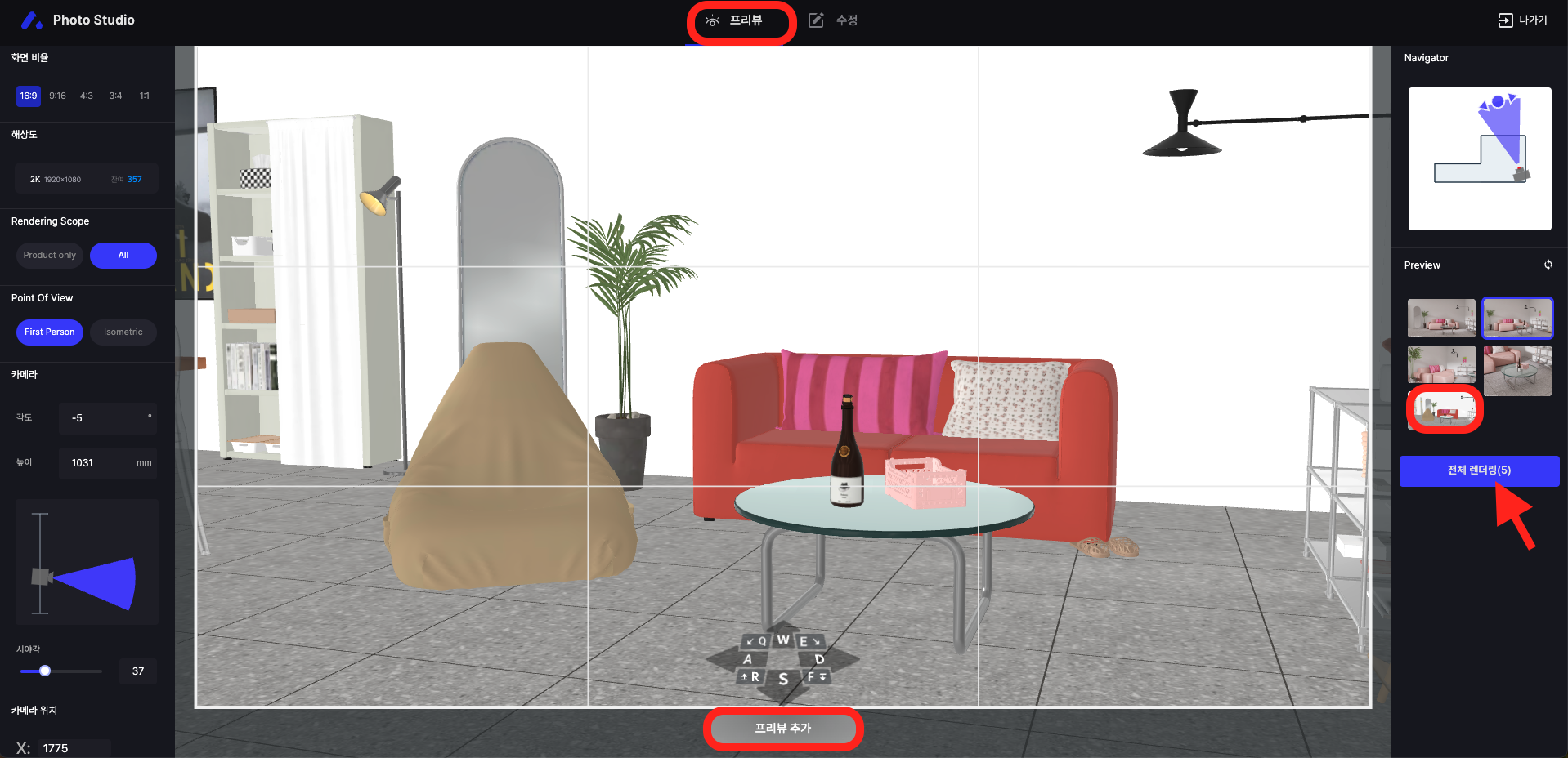 수정을 완료한 후 [프리뷰 추가] 클릭 → [전체 렌더링] 버튼을 눌러 렌더링을 시작합니다.