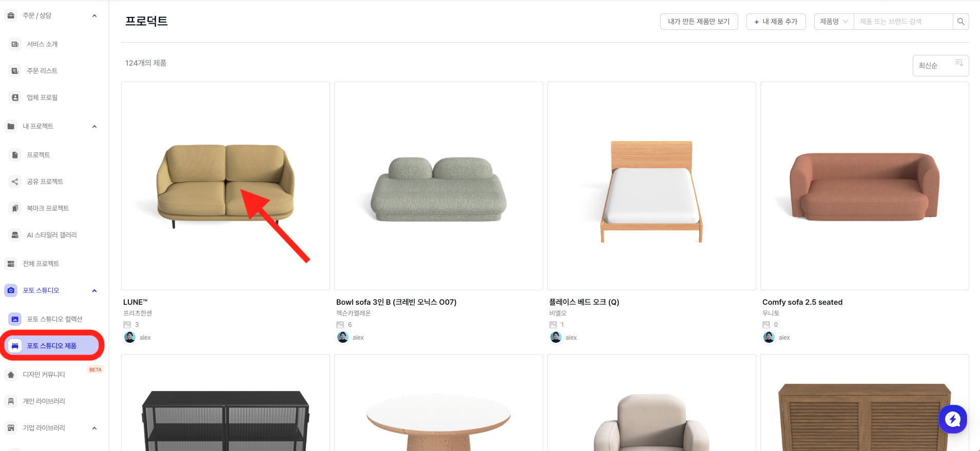 렌더링이 완료될 때까지 기다리지 않아도 [포토 스튜디오 제품] 탭에서 제품을 클릭하면 종료한 페이지와 동일한 페이지가 열립니다.