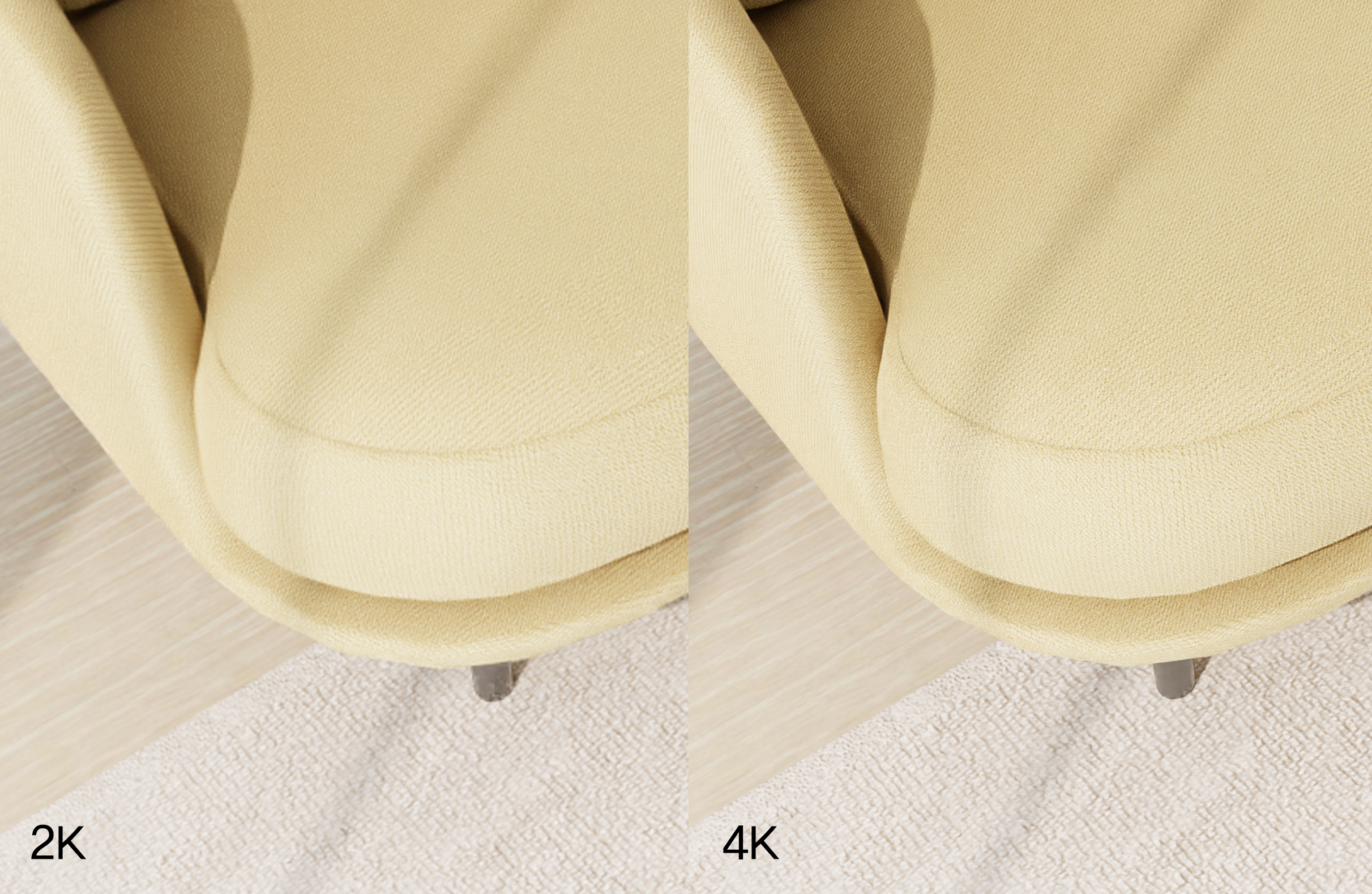 전체 샷을 비교했을 때, 4K 해상도가 더 많은 디테일을 담고 있어 더 선명하고 사실적인 이미지를 제공합니다. 2K는 일반적으로 더 작은 파일 크기와 빠른 렌더링 속도를 제공하지만, 디테일은 4K보다는 떨어질 수 있습니다.