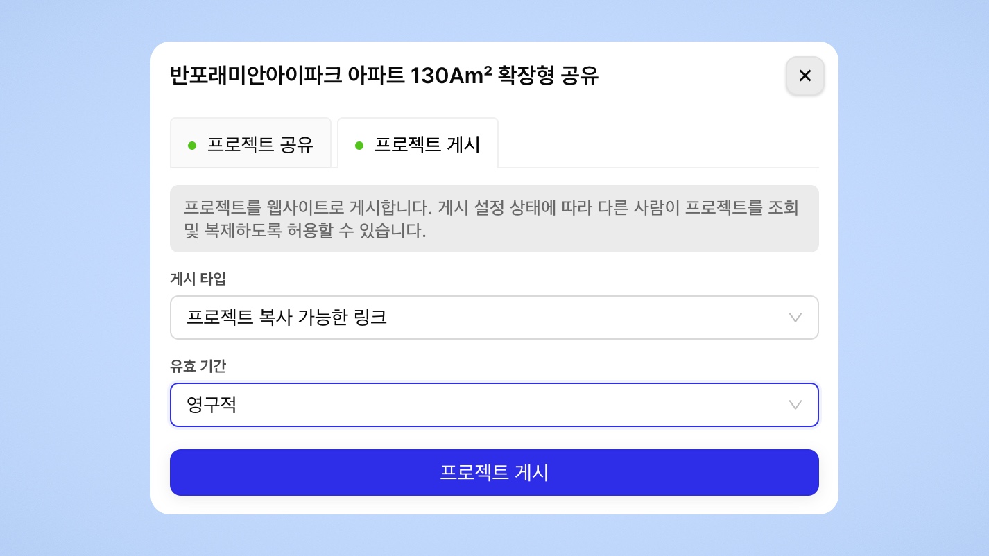 프로젝트를 게시하면 추가로 생성한 렌더샷, 720투어 등이 실시간으로 보이게 되고, 도면 수정 시에도 실시간으로 반영돼요.고객이나 다른 사람에게 보여주고 싶다면 프로젝트를 복사하여 이름을 구분하고 작업용과 공유용을 따로 구분해서 작업하는 걸 추천드려요!