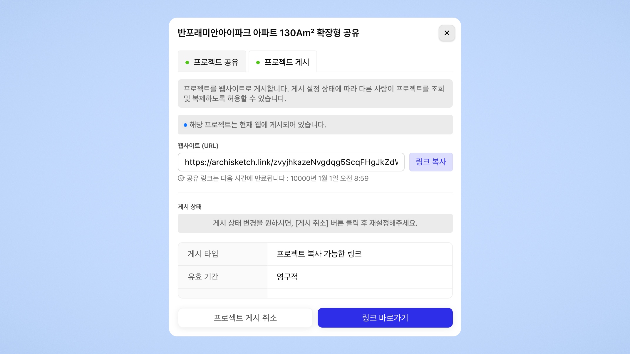 프로젝트 복사 가능한 링크: 아키스케치 유저는 이 링크로 프로젝트를 복사할 수 있어요.