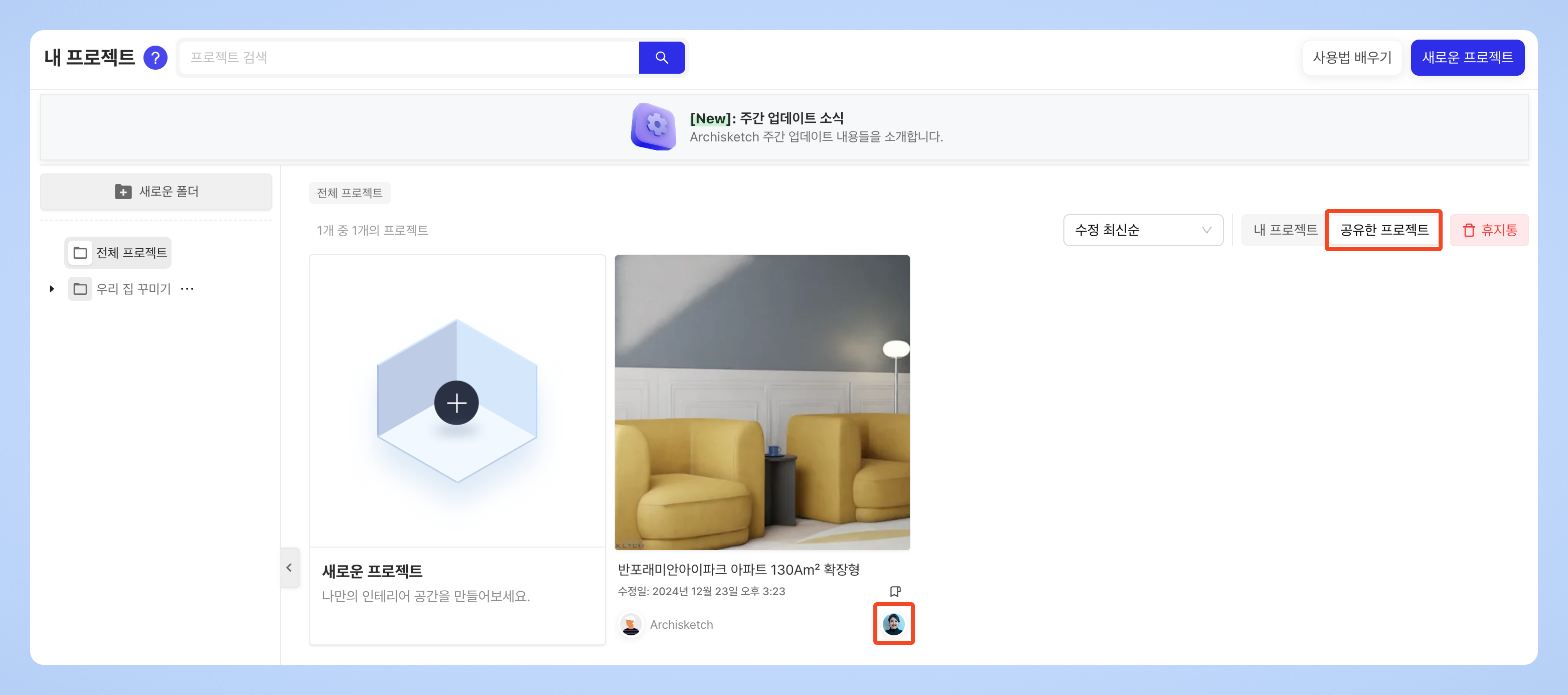 내가 공유한 프로젝트는 내 프로필 옆에 공유 받은 사람의 프로필이 함께 표시돼요. 또한, 내 프로젝트에서 [공유한 프로젝트] 보기를 켜면 내가 공유한 프로젝트만 따로 모아서 볼 수 있어요.