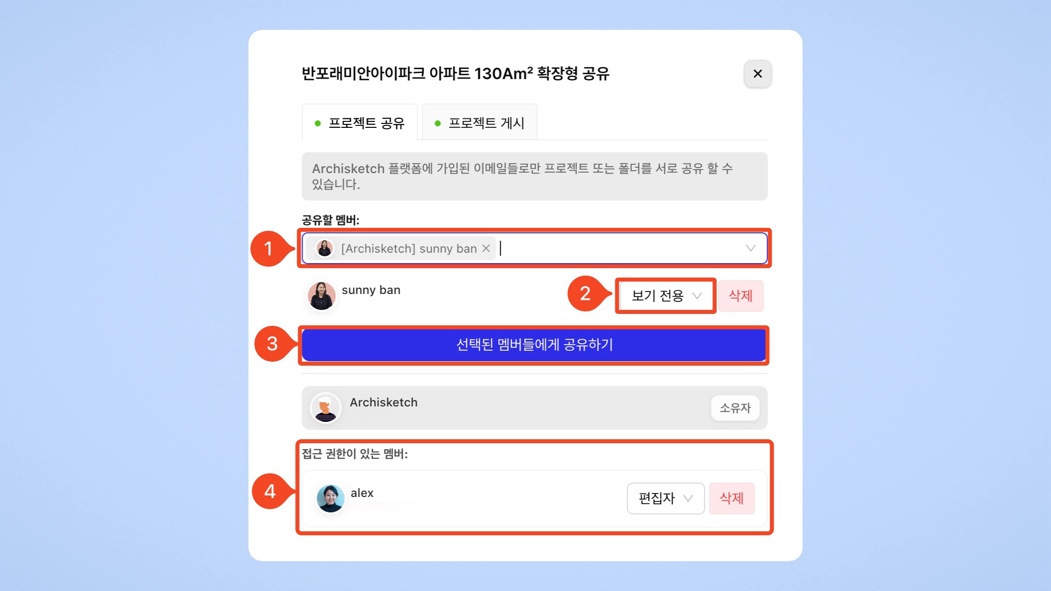 아키스케치에서는 프로젝트를 다른 사람과 쉽게 공유할 수 있는 두 가지 방법이 있어요! 프로젝트를 아키스케치 가입 유저에게는 편집자나 보기 전용 모드로 공유할 수 있고, 비회원에게는 프로젝트 링크를 통해 인테리어 공간이나 렌더샷 등 콘텐츠를 공유할 수 있어요. 이 기능을 통해 다른 사람들과 프로젝트를 손쉽게 협업하거나 보여줄 수 있습니다.