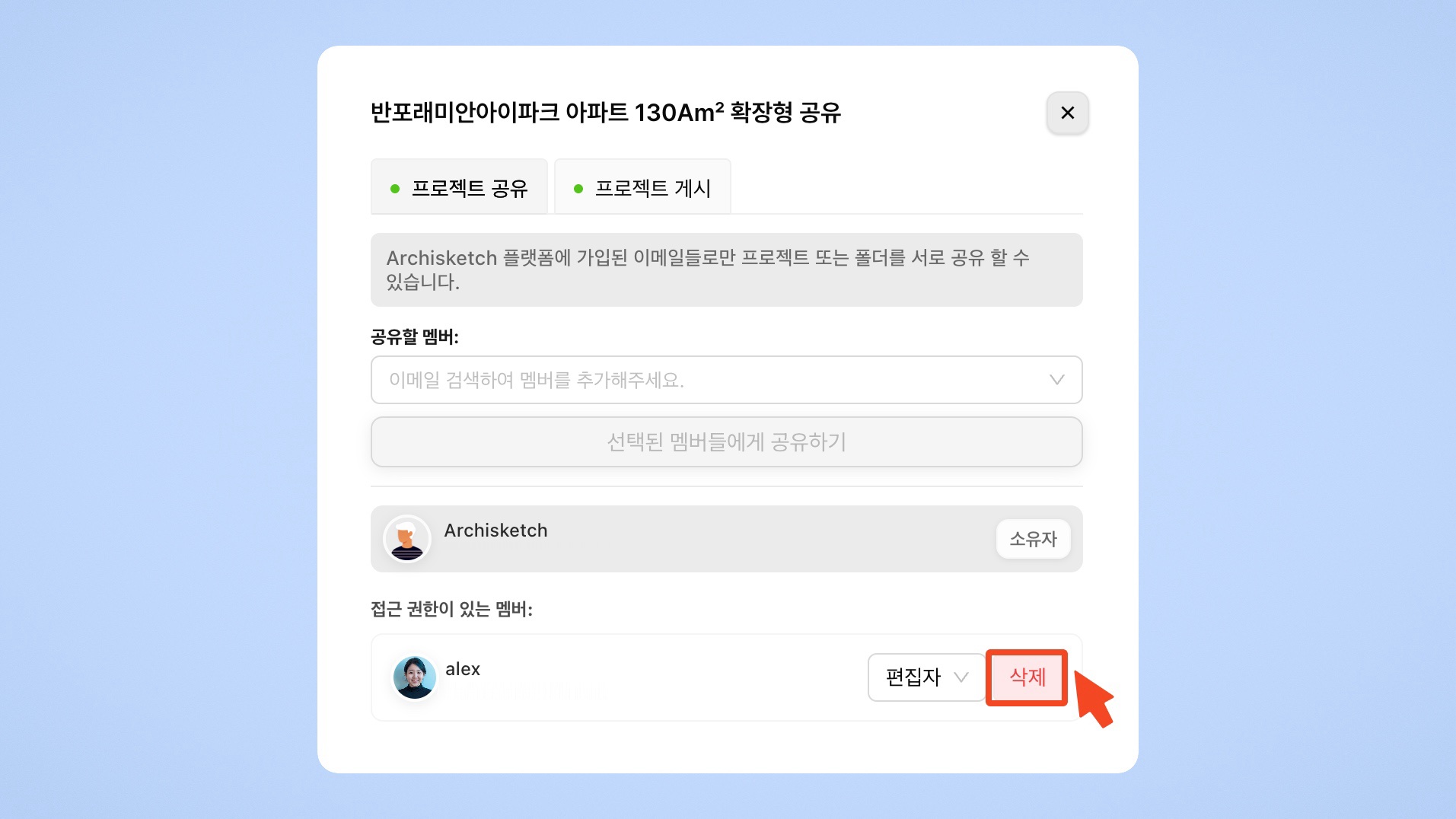 프로젝트의 공유를 해제하려면, 프로젝트에서 [더보기] 클릭 후 프로젝트 공유를 선택하세요.그 다음, 접근 권한이 있는 멤버 목록에서 공유를 해제하려는 멤버 옆에 있는 [삭제] 버튼을 클릭하면 됩니다.