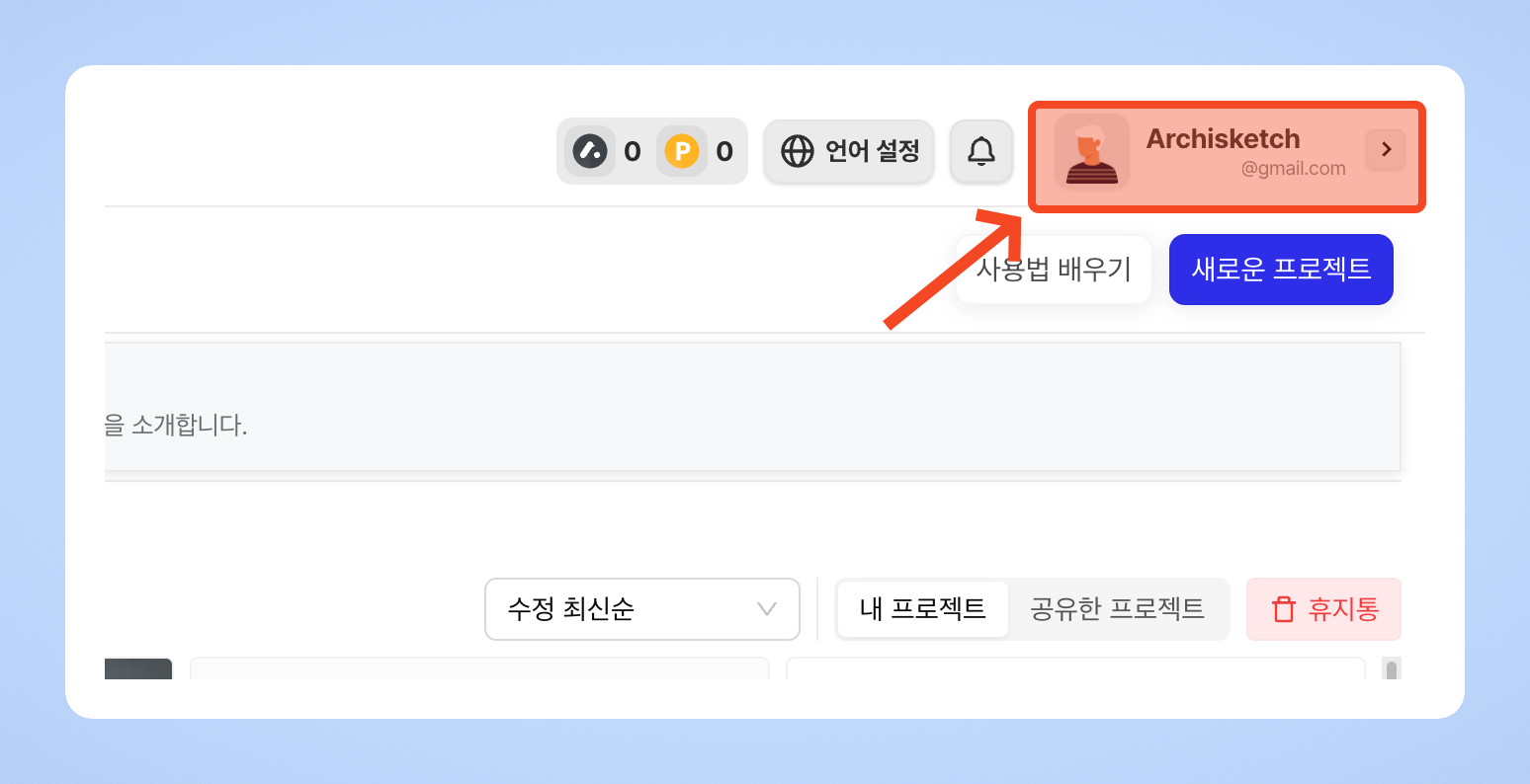 아이디가 검색되지 않으면, 먼저 아키스케치에 가입한 유저인지 확인해 주세요. 아이디(이메일) 확인은 페이지 우측 상단의 계정 프로필에서 확인할 수 있습니다. 만약 가입한 유저가 아니라면, 프로젝트 공유가 불가능하니 가입을 먼저 진행해 주세요!