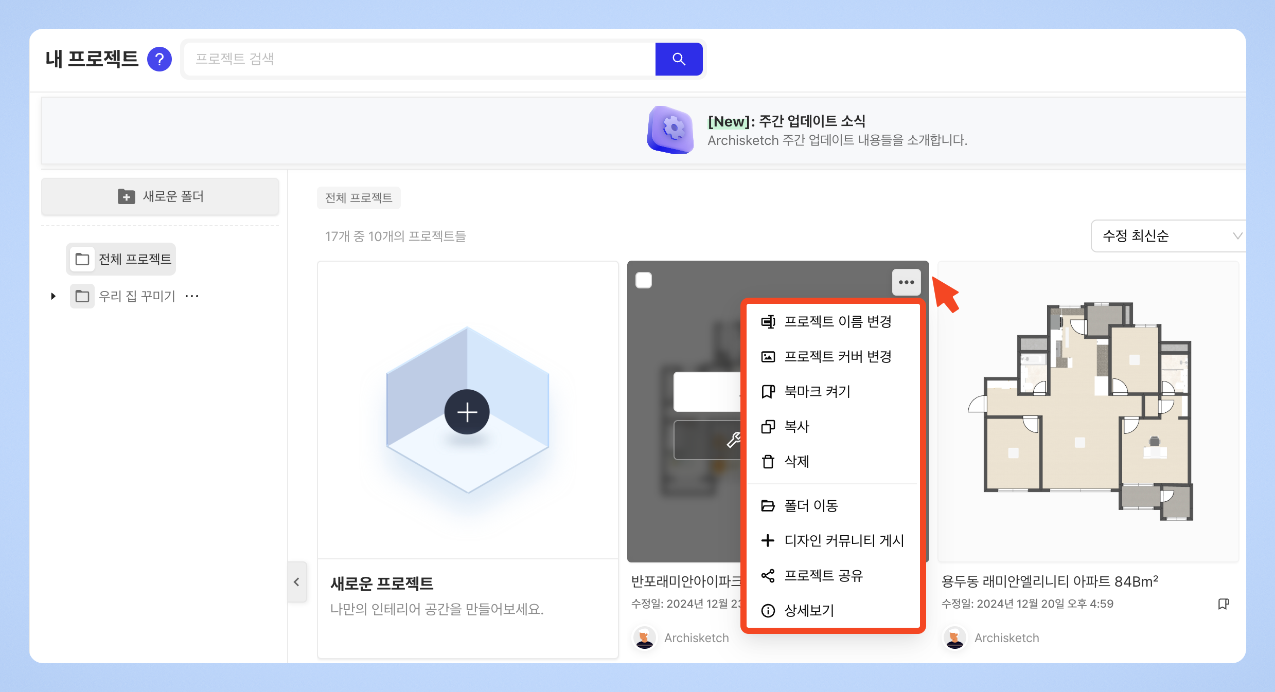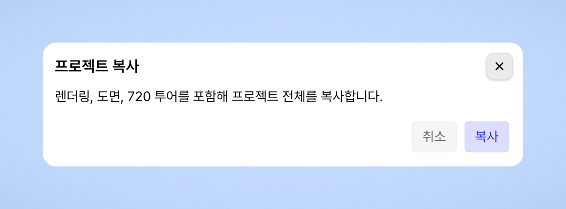 복사된 프로젝트에는 렌더링, 도면, 720 투어 등 모든 콘텐츠가 포함됩니다.