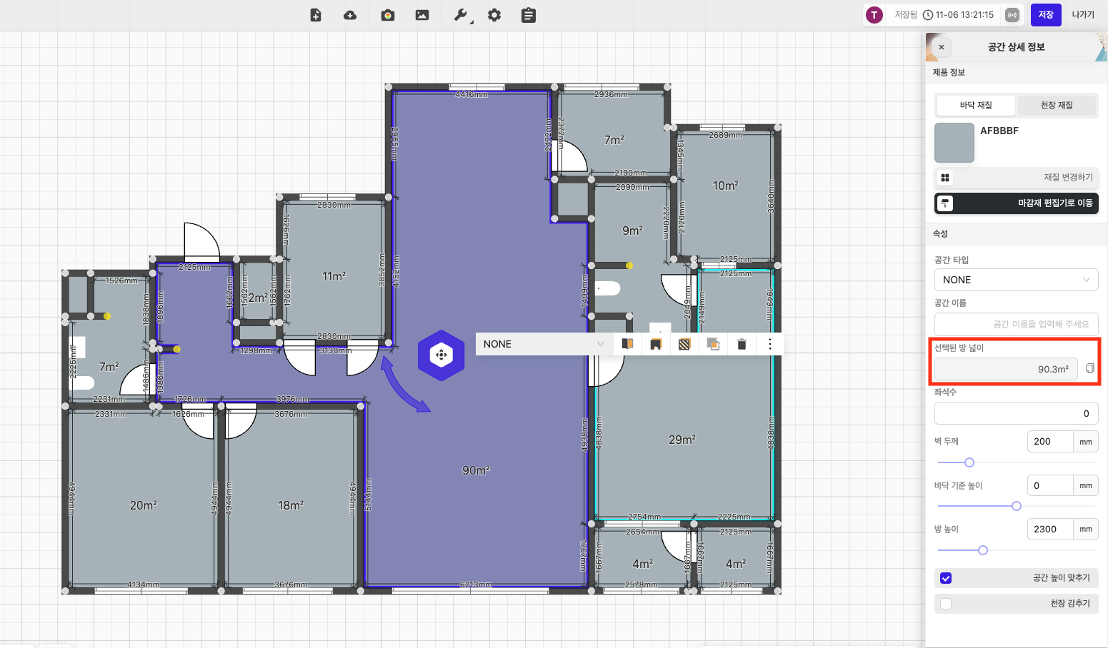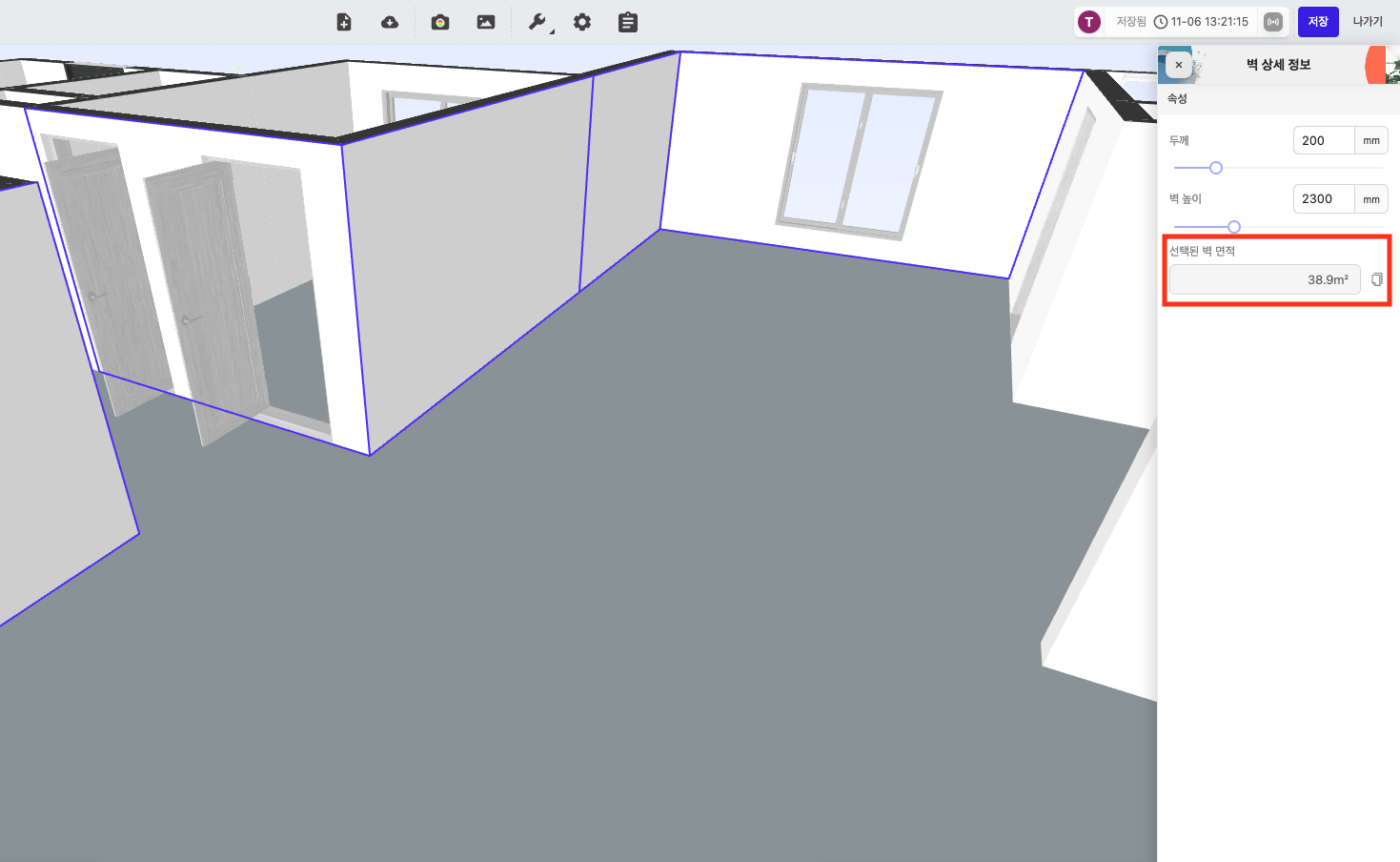 방이나 벽 클릭 시, 단일 및 다중 선택 면적을 합산하여 표시하는 기능이 추가되었습니다.