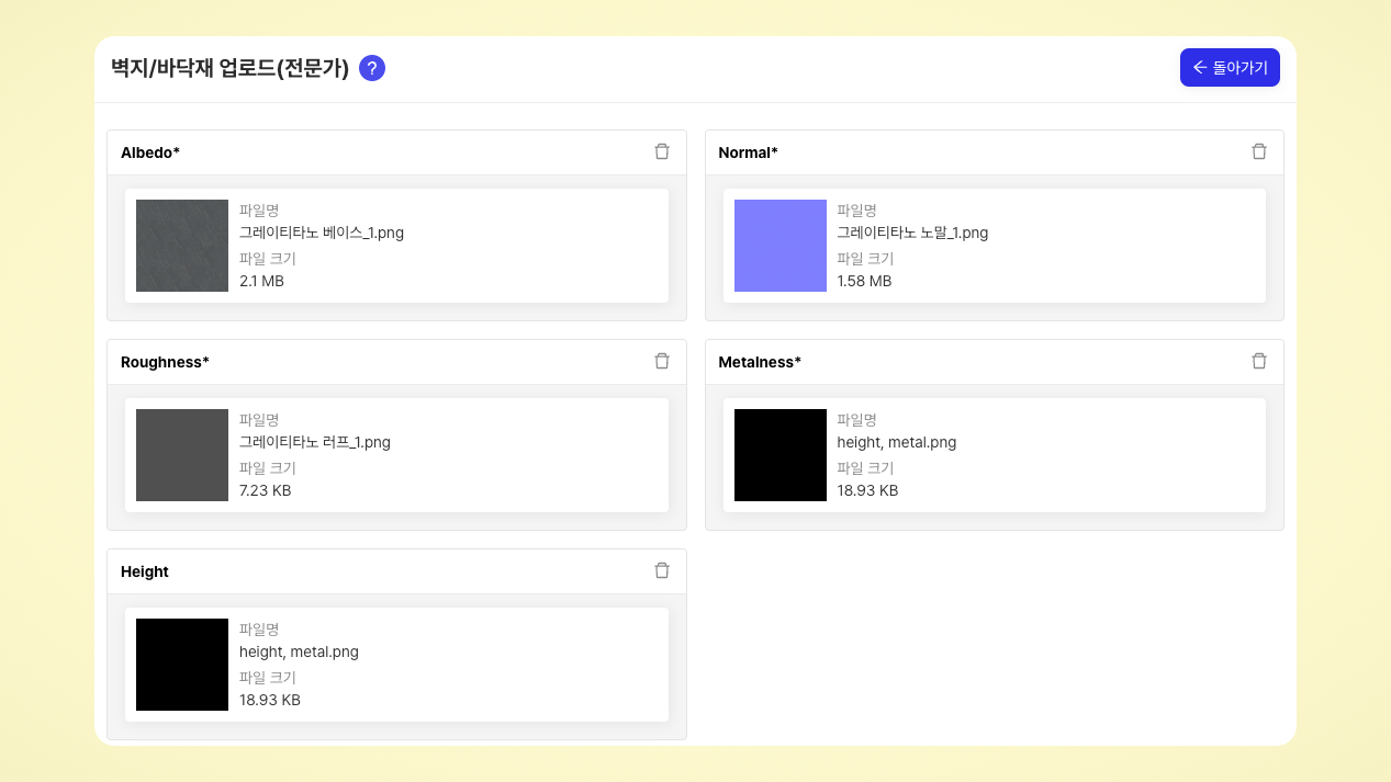 업로드 시 노말맵 / 러프니스 / 메탈 값을 함께 설정할 수 있어, 고퀄리티 재질 표현이 필요한 경우 유용하게 활용할 수 있습니다.