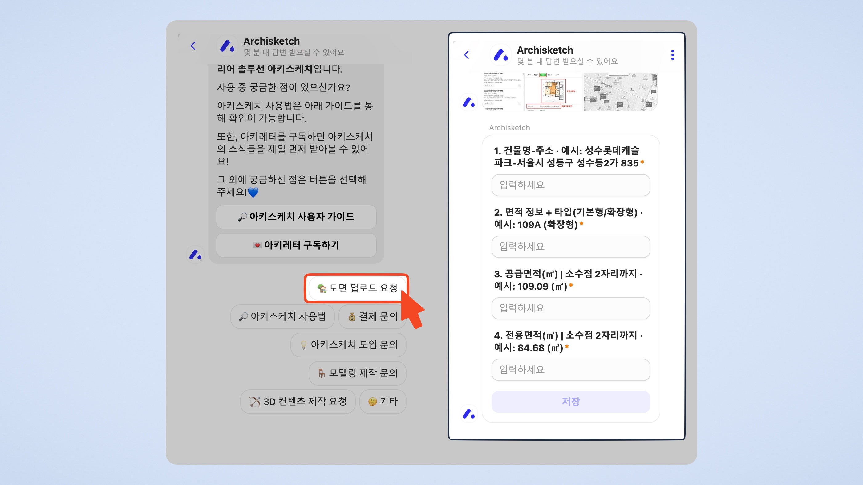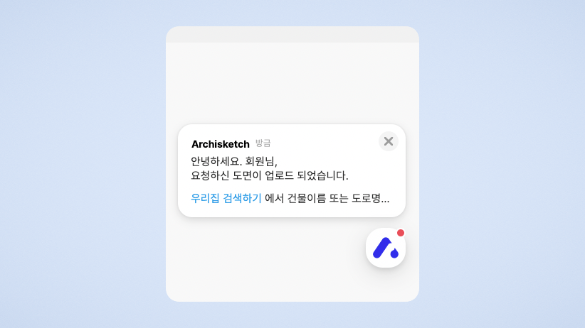 업로드가 완료되면 아키스케치 홈페이지 우측 하단 채널톡 채팅창으로 안내드립니다.