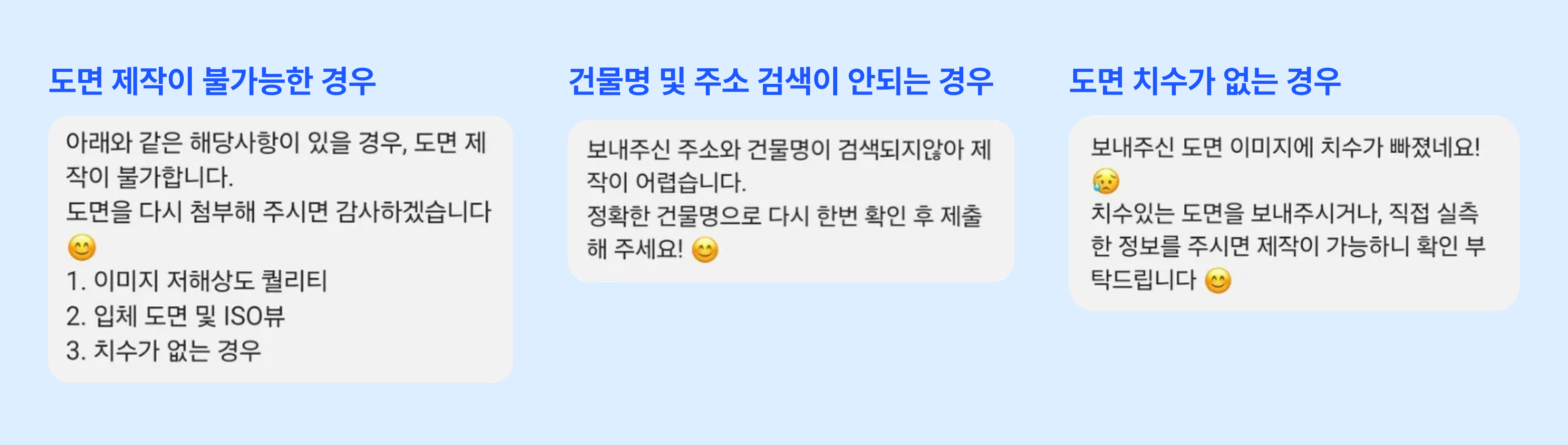 정보가 누락 됐거나 도면 제작에 적합하지 않은 이미지일 경우, 24시간 내에 알림톡으로 정보 재요청 메세지를 발송합니다.