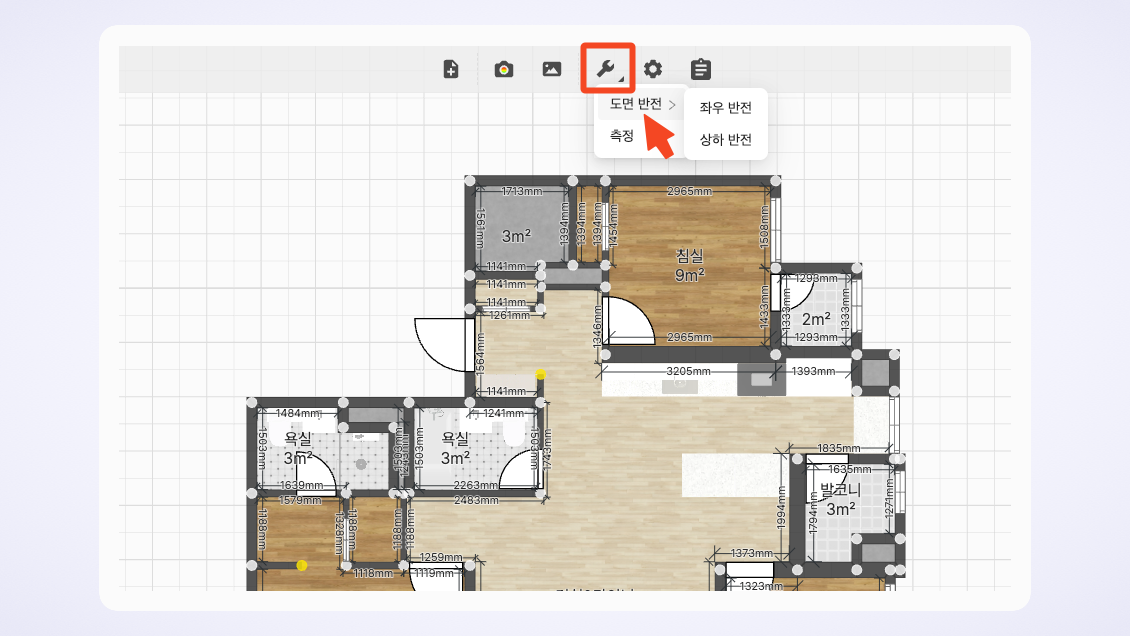 에디터 상단 → 공구 모양 아이콘 클릭 → 도면 반전하기