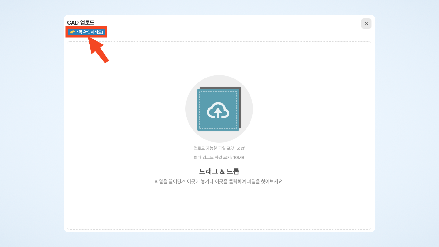[도면 업로드] → [CAD 업로드] → [파일 선택] 순서대로 진행합니다.