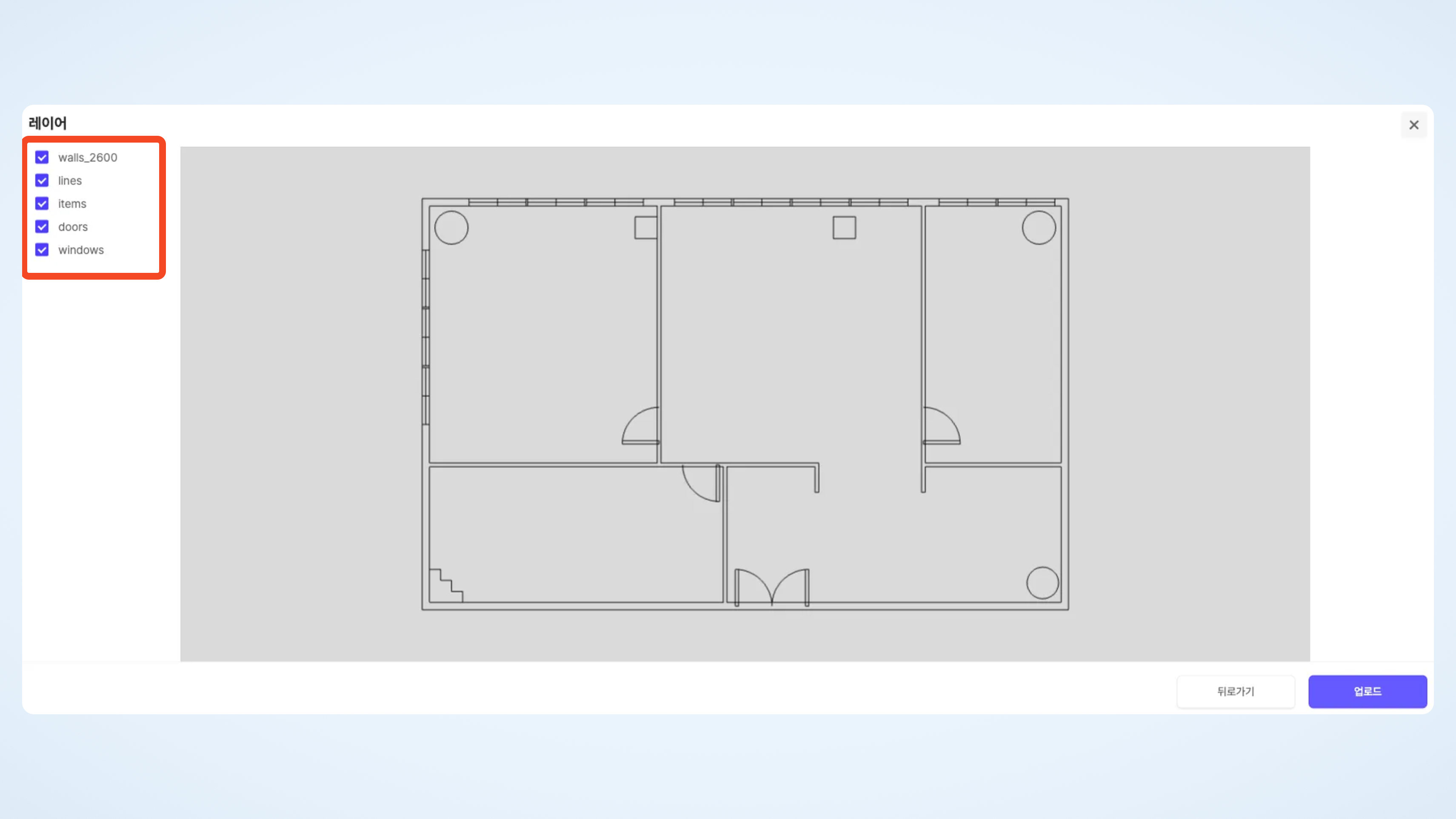 아키스케치는 CAD 도면 업로드 기능을 지원합니다. 하지만 업로드 전, 도면의 Layer가 아키스케치의 요건에 맞게 정리되어 있어야 합니다. Layer 정리가 되지 않으면 오류가 발생할 수 있으므로, 반드시 아래의 안내를 참고하여 정리 후 업로드해 주시기 바랍니다.