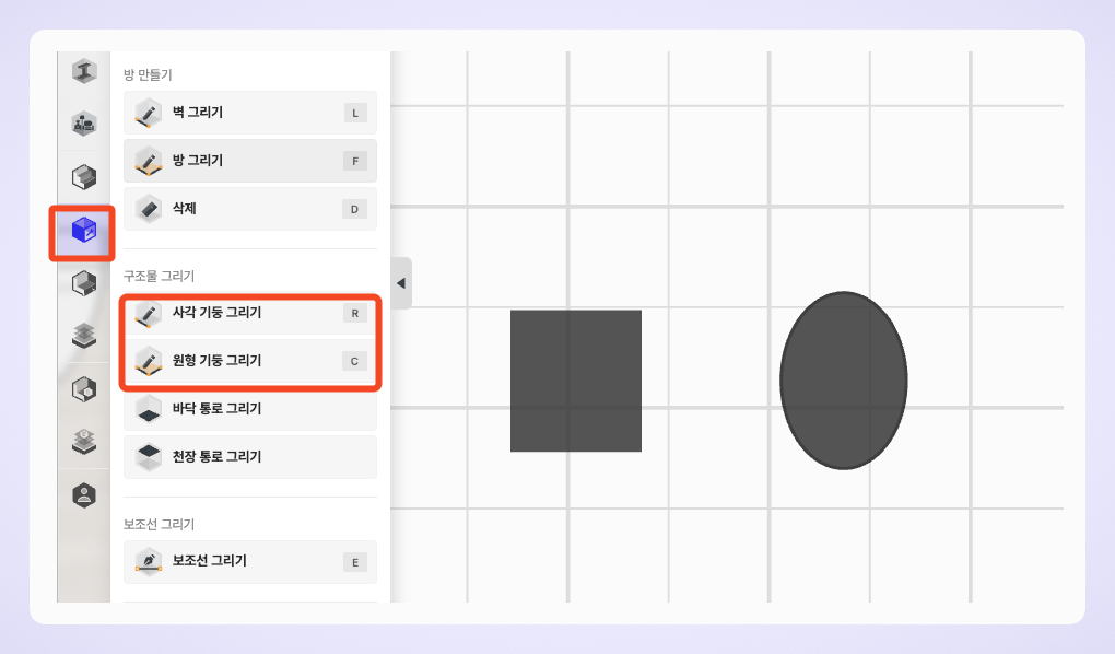 기둥은 업로드가 완료된 후, [건축/자재 편집기]에서 '밀기/당기기' 기능을 이용해 원하는 높이로 조정할 수 있습니다.