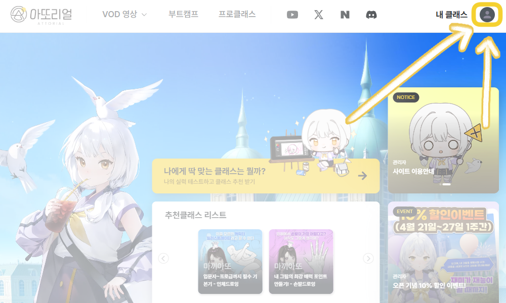 ๋ก๊ทธ์ธ ํ, ์ฐ์ธก ์๋จ์ '๋ด ํด๋์ค' ์ ์์ด์ฝ์ ๋๋ฌ์ฃผ์ธ์.
