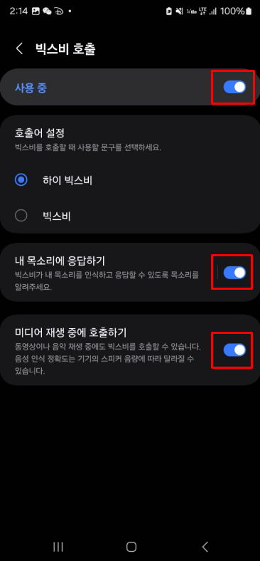 STEP03 사용중 활성화 ▶ 내 목소리에 응답하기 + 미디어 재생중에 호출하기 활성화
