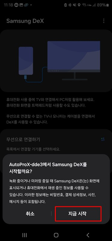 STEP02 휴대폰 설정 ▶ DeX 실행 ▶ 팝업에서 지금 시작
