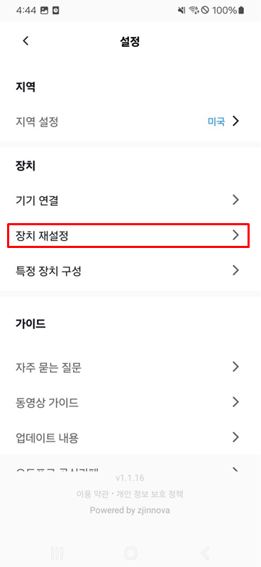 앱의 설정 메뉴에서 장치 재설정 할 경우