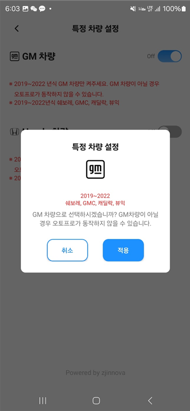 STEP02 GM 차량 ▶ ON으로 활성화 ▶ 팝업 ▶적용