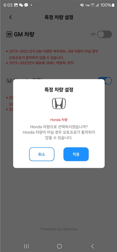 STEP02 Honda 차량 ▶ ON으로 활성화 ▶ 팝업 ▶적용