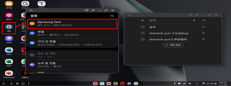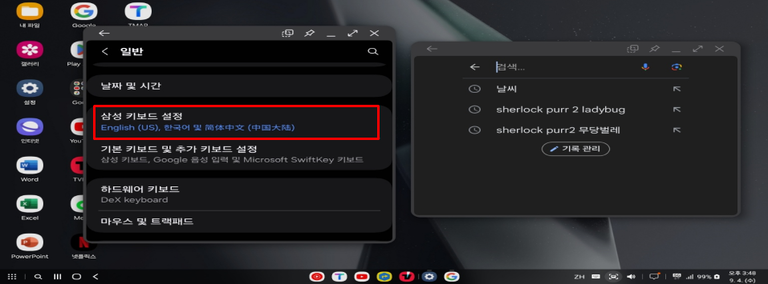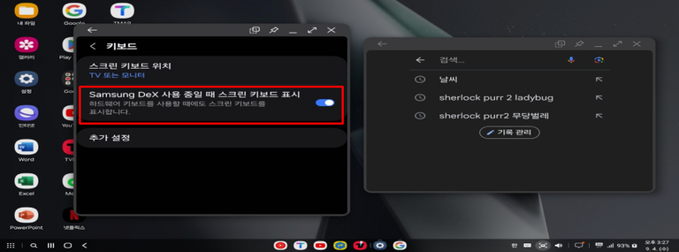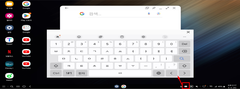 DeX는 입력창(검색창) 터치 시 화면에 키보드가 자동으로 표시되어 텍스트를 입력할 수 있습니다. 자동으로 키보드가 표시되지 않는다면, 아래의 방법을 사용해 주세요.