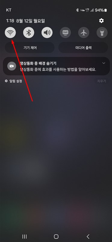 STEP01 폰상단(노티바) 아래로 슬라이드 ▶ 설정 화면 ▶ 와이파이 버튼 길게 누르기