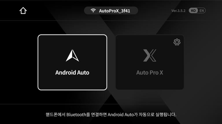 차량 화면에 노출되는 AutoPro X 초기 화면에서 Android Auto(그림상 좌측)를 선택합니다.
