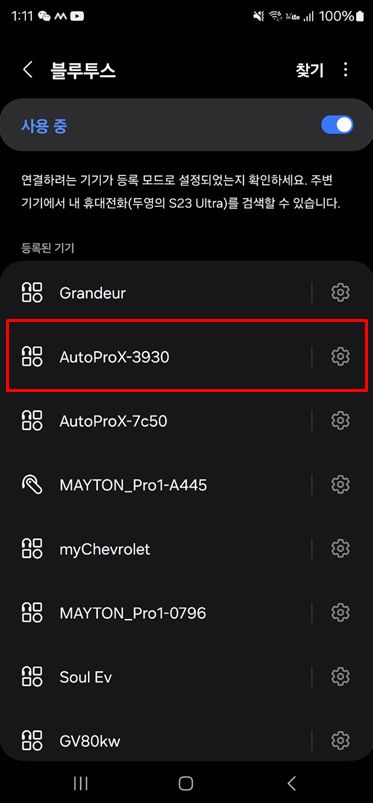 블루투스 설정에서 AutoProX-XXXX를 선택하여 연결합니다. 블루투스 연결이 완료되면 와이파이는 자동으로 연결됩니다.