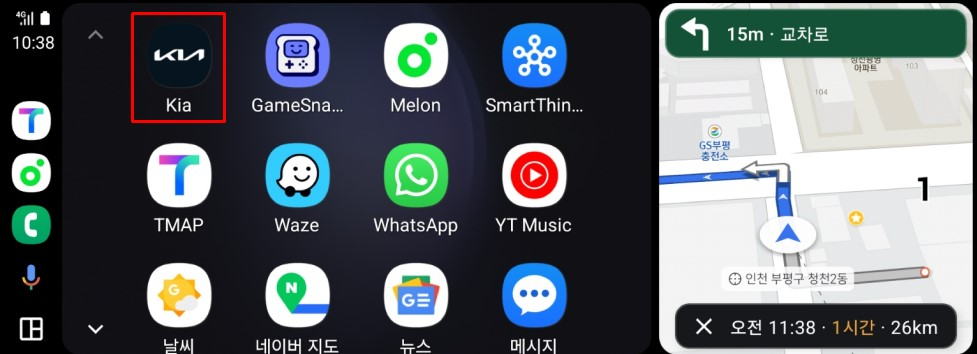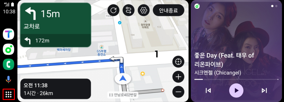 자동으로 안드로이드 오토가 연결됩니다. 안드로이드 오토를 종료하기 위해 좌측 하단의 앱 버튼을 선택합니다.