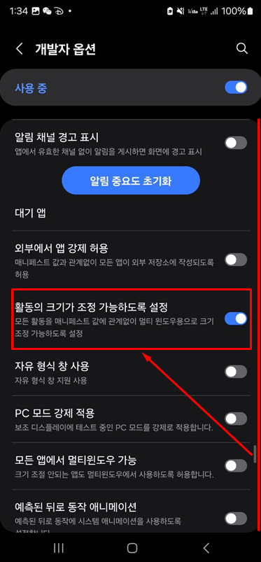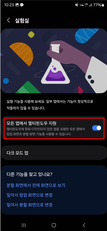 STEP03 실험실 ▶ 모든 앱에서 멀티윈도우 지원 : 활성화