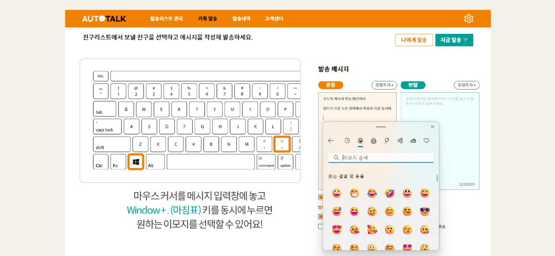 발송메시지 입력창에서 이모지 삽입을 원하는 위치에 커서를 두고