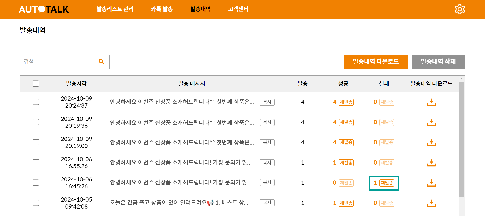 발송내역 메뉴에서 발송에 실패한 메세지를 [재발송] 버튼을 눌러 다시 발송해보세요.