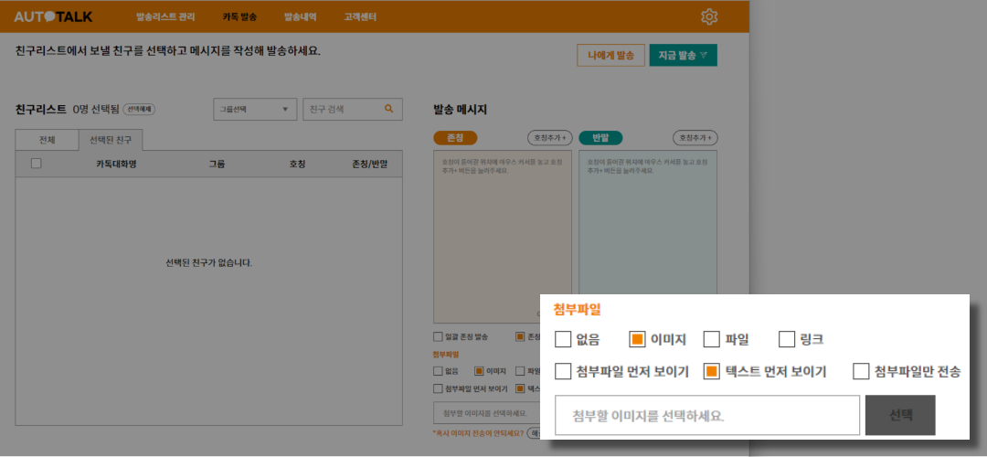 ① 발송메시지 하단 > 첨부파일 선택 옵션에서 이미지 / 파일 / 링크 중 원하는 파일 형식 선택