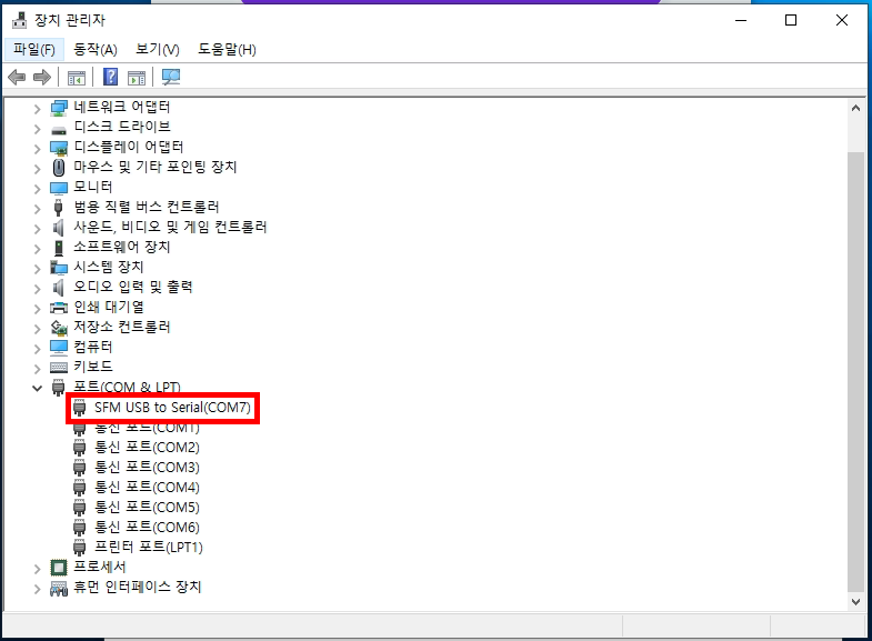→ 만약 SFM USB to Serial COM0 포트번호가 확인되지 않으면