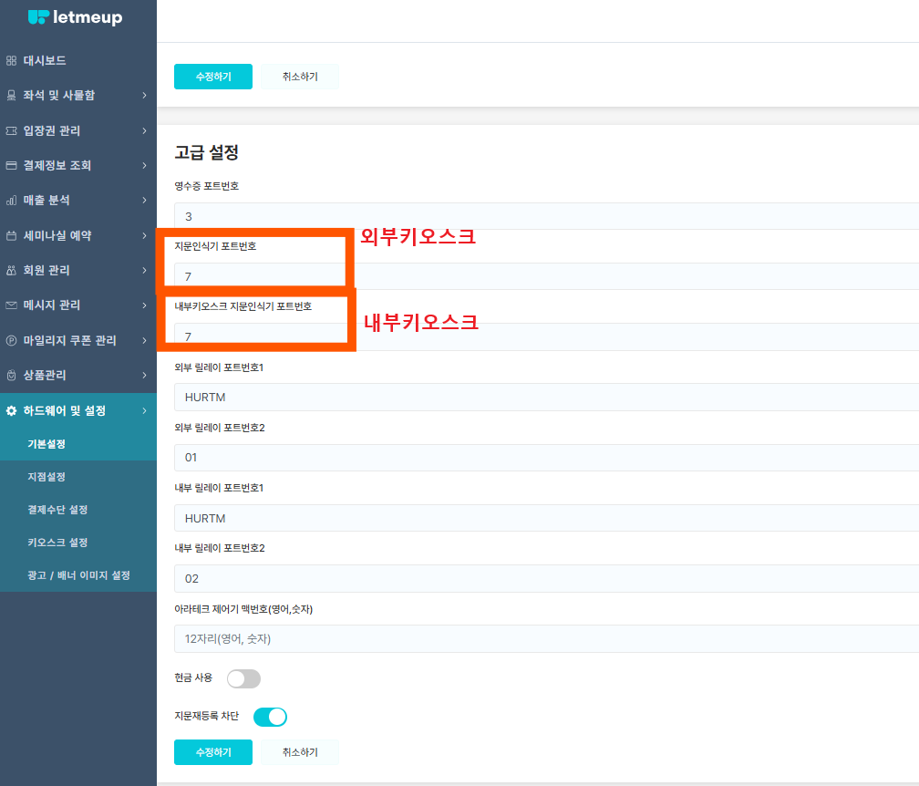 고급설정-지문인식기(내부키오스크 지문인식기) 포트번호 확인
