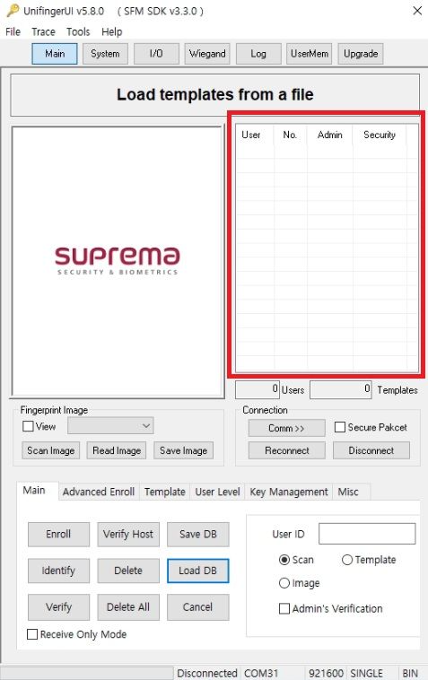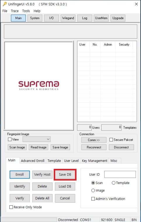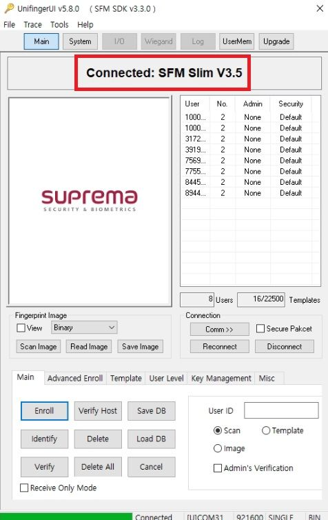 지문데이터 저장이 완료되었다면, UniFinger 지문인식기 프로그램에