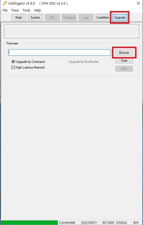 UniFinger 프로그램에서 Upgrade > Browse 클릭하여