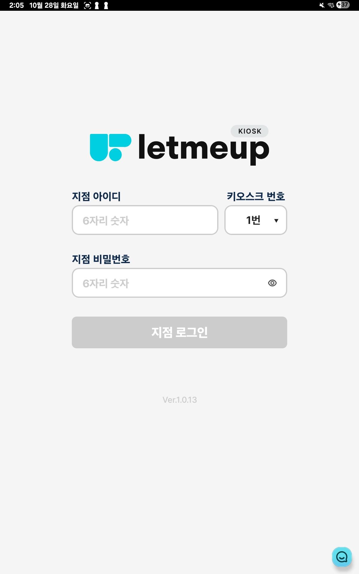 앱을 처음 설치하면 나오는 화면이에요. 해당 매장의 지점아이디(6자리) 와 비밀번호(6자리) 를 입력해주세요.