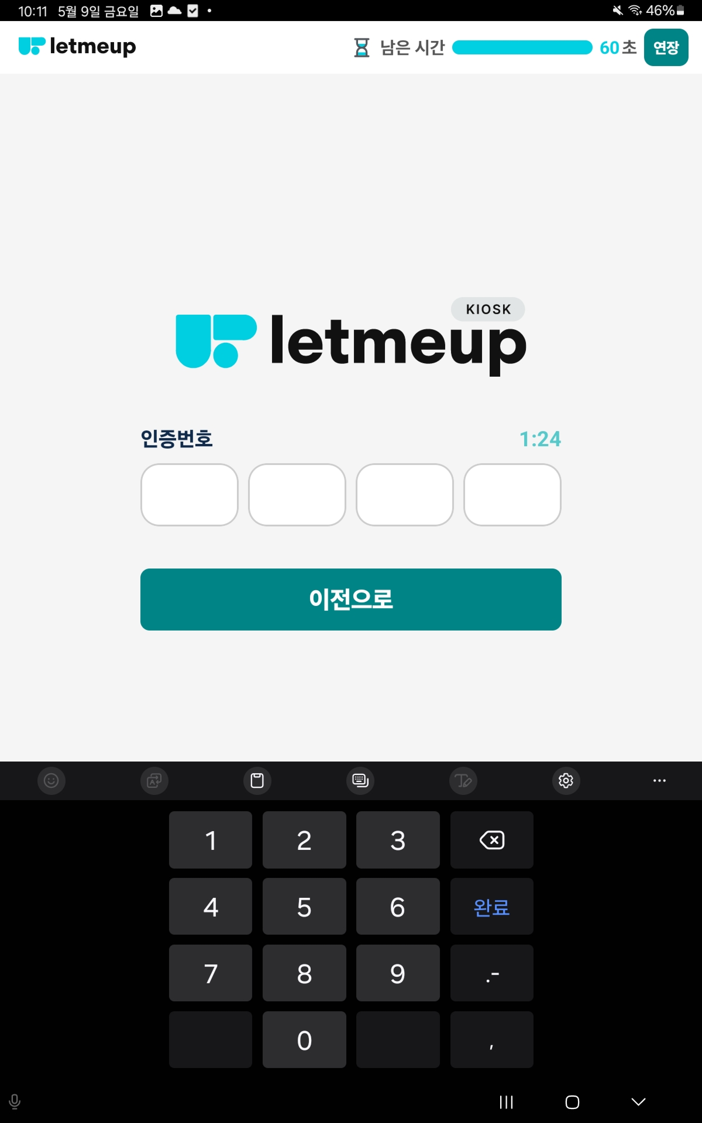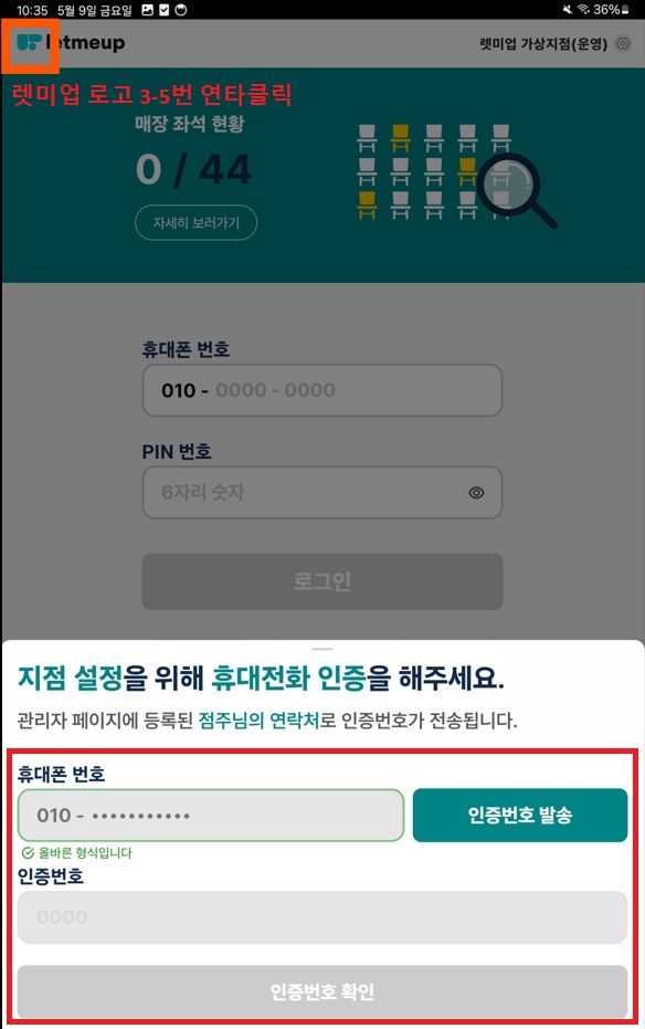 메인화면에서 좌측 상단 렛미업 로고를 3-5번 연타 클릭하면, 하단에 인증 절차가 생성됩니다.