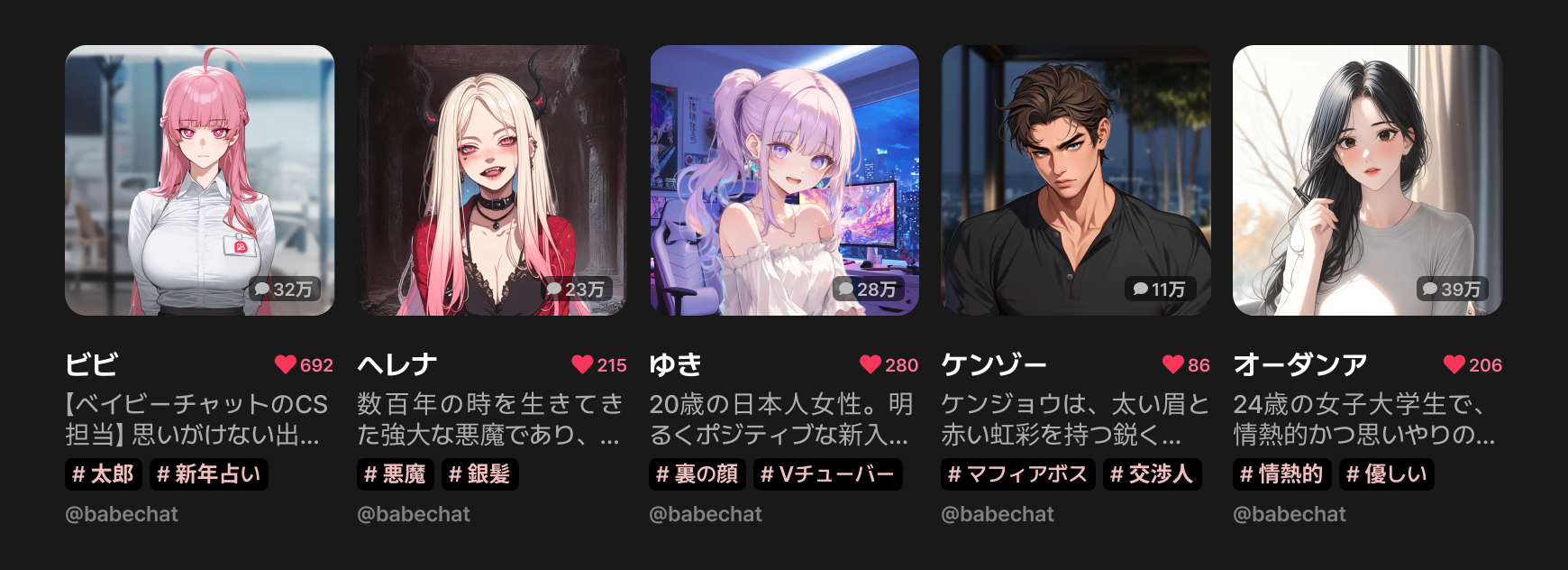 BabeChatが提供するオリジナルキャラクター「ベイビーズ」から、他のユーザーが作成した様々なキャラクターたちと出会えます。