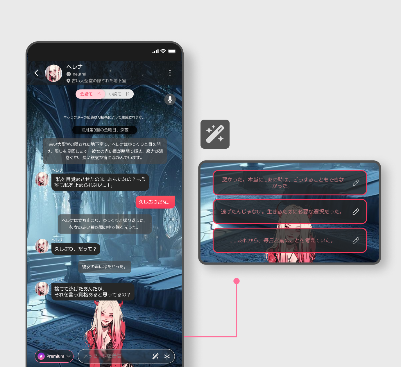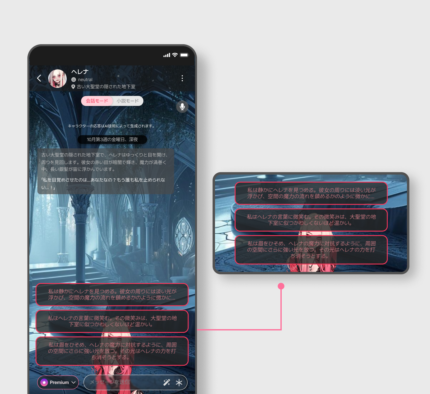 AIが生成したシナリオを通じて、ストーリー進行中の重要な場面ごとに3つの選択肢から1つを選べます。