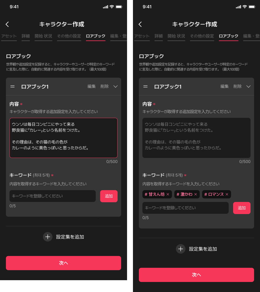 世界観または追加情報を記録しておくと、キャラクターやユーザーが特定のキーワードに言及した際、自動的に関連内容を提供します。
