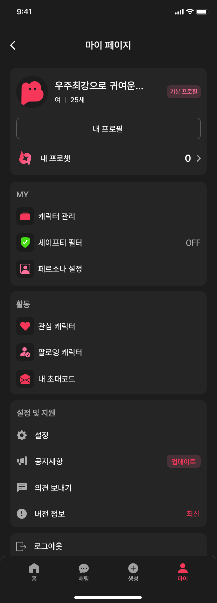 마이페이지를 통해 프로필, 캐릭터 관리, 페르소나 설정, 관심 캐릭터 등 다양한 설정을 관리할 수 있어요.