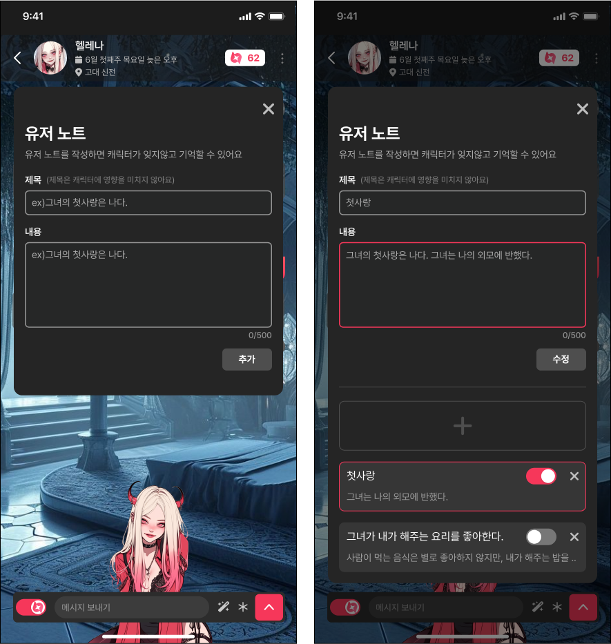 과거 배경, 캐릭터 성격, 특징 등을 통해 나만의 채팅을 이어가보세요.