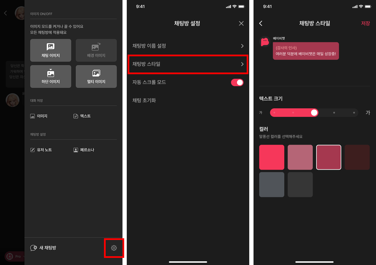 채팅방의 오른쪽 위 메뉴 ⋮ 버튼 > 메뉴 하단의 채팅방 설정 > 스타일 을 통해 채팅창의 컬러, 폰트 크기를 원하는 대로 설정할 수 있어요. 상단 미리보기 화면을 통해 간편하게 확인하실 수 있어요.