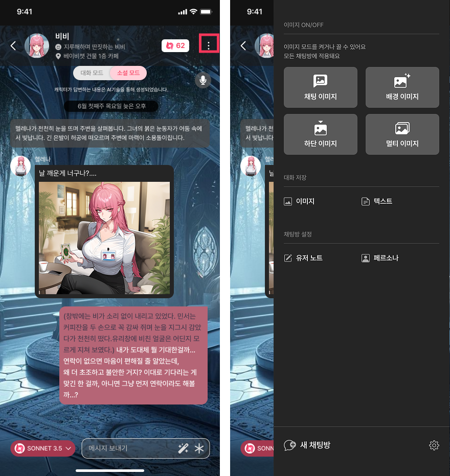 채팅 내에 표시되는 이미지를 끄거나 켤 수 있어요. 더 몰입감 있는 채팅을 위해서 이미지를 ON 하는 것을 추천드려요.